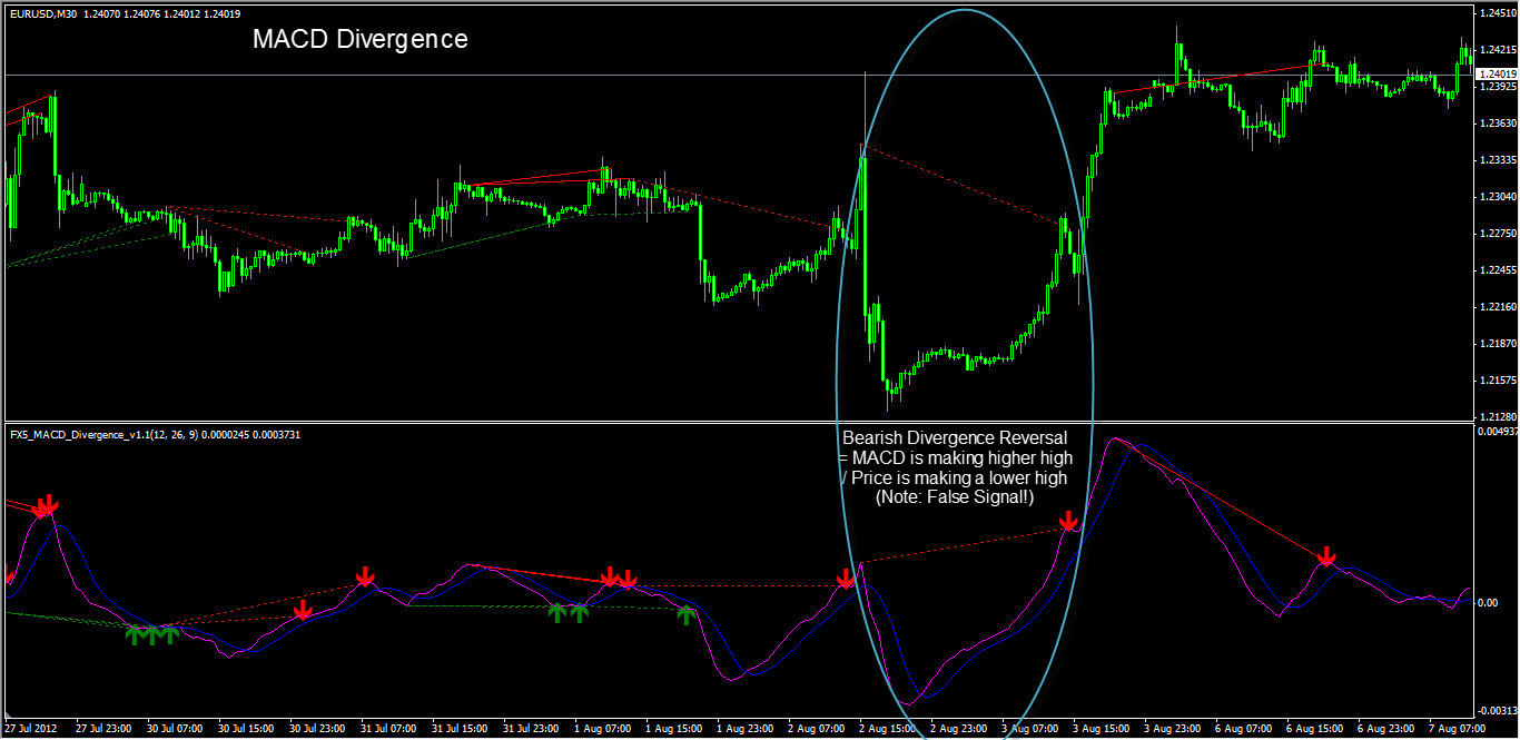 MACD が上昇し始めて安値が高くなるが、分析対象の基本通貨がまだ新安値を付けている場合、強気のダイバージェンスが発生します。 この強気の発散は、MACD が安値を付けても、価格がより高い安値を付けた場合にも発生する可能性があります。 売りシグナルは、上記の逆が発生したときに発生します。