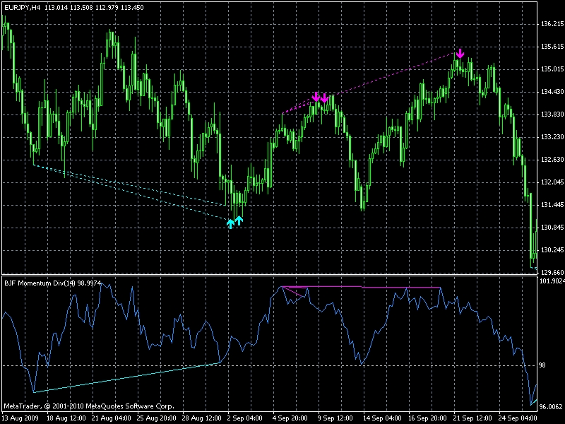 このアプローチは、市場の天井は通常、急速な価格上昇 (誰もが価格の上昇を期待しているとき) によって識別され、市場の底値は通常、急速な価格下落 (誰もがそこから抜け出したいと考えているとき) によって終わると想定しています。 市場がピークに達すると、モメンタム指標は急激に上昇し、その後下落し、価格の持続的な上向きまたは横向きの動きから逸脱します。 同様に、市場の底では勢いが急激に低下し、その後価格を大きく上回る上昇を始めます。 これらの状況は両方とも、インジケーターと価格の間の乖離につながる可能性があります。