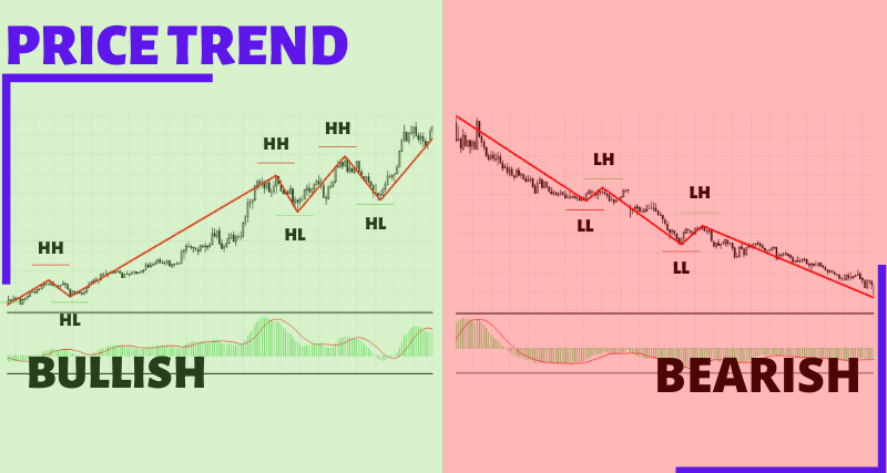 견적이 하락세에 있으면 가격은 저점이 낮아지고 고점이 낮아지며 이는 되돌림이기도 합니다. 수직선에서는 추세가 오르거나 내리지 않습니다. 추세는 더 긴 방향성 펄스와 지그재그 패턴의 되돌림으로 구성되며 이는 추세 내 진입 기회로 해석됩니다.