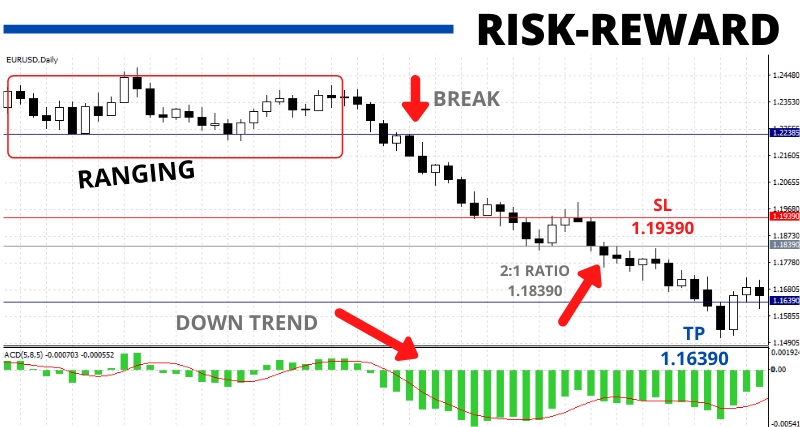대부분의 트레이더가 관심을 갖는 최소 비율은 2:1입니다. 이는 계정 레버리지에 따라 20달러의 미니랏 포지션을 위험에 빠뜨리고 40달러의 수익을 두 배로 늘리는 것을 의미합니다. 거래의 위험 보상 비율을 계산할 때 진입 가격, 손절매 가격 및 이익 실현 가격을 고려해야 합니다. 이는 2:1 위험 대 보상 비율의 예입니다.