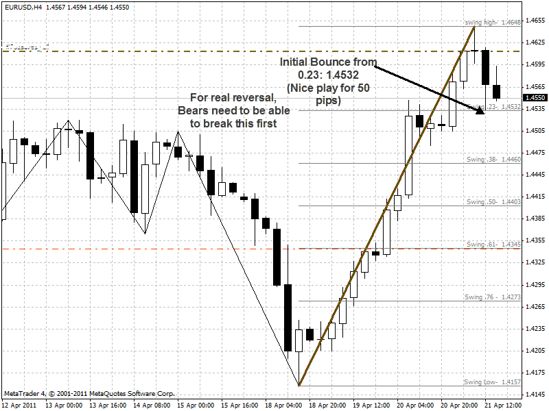 请注意,在 4 月 13 日,第一水平 (23.6%) 似乎阻止了熊市的修正行动,并为多头提供了一些反弹。 如果您在摆动高点附近获利了结,您将获利 50 点左右。