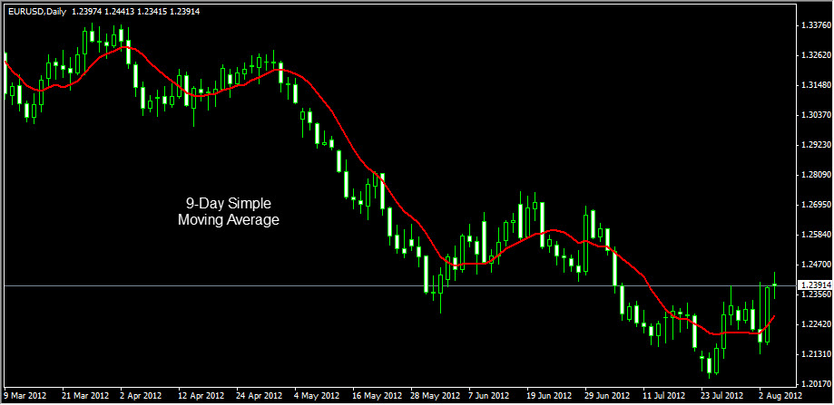 简而言之,简单移动平均线是一种货币在一段时间内的平均值。 例如,9 天简单移动平均线是最近 9 天价格的平均值。 它是通过将一种货币的最后 9 天收盘价的总和除以 9 来计算的。当在计算期间对每个价格赋予相同的权重时,它被称为简单。 其他类型的移动平均线是加权平均线和指数平滑平均线,我们将在后面讨论。