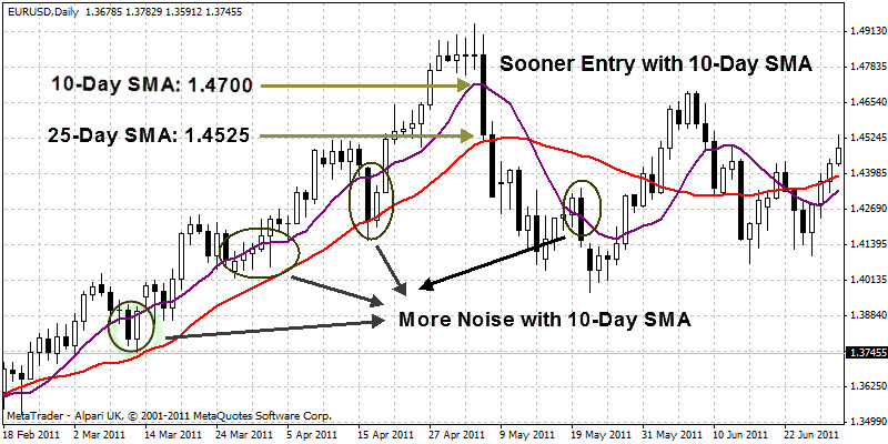 这是 2011 年 5 月的屏幕截图,比较了 25 天移动平均线和较短的 10 天移动平均线:
