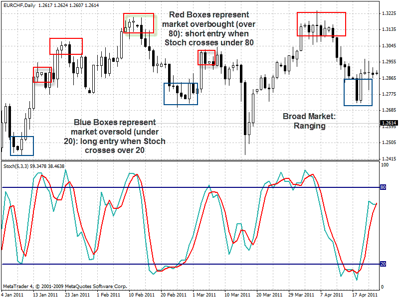 EURCHF 日线图上的随机指标超买/超卖交易示例:
