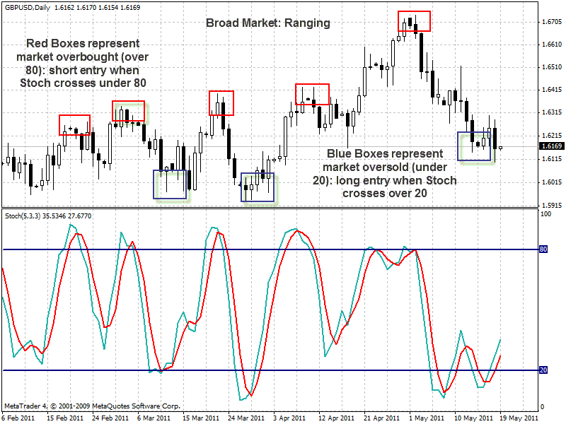 英镑/美元日线图上的随机指标超买/超卖交易示例: