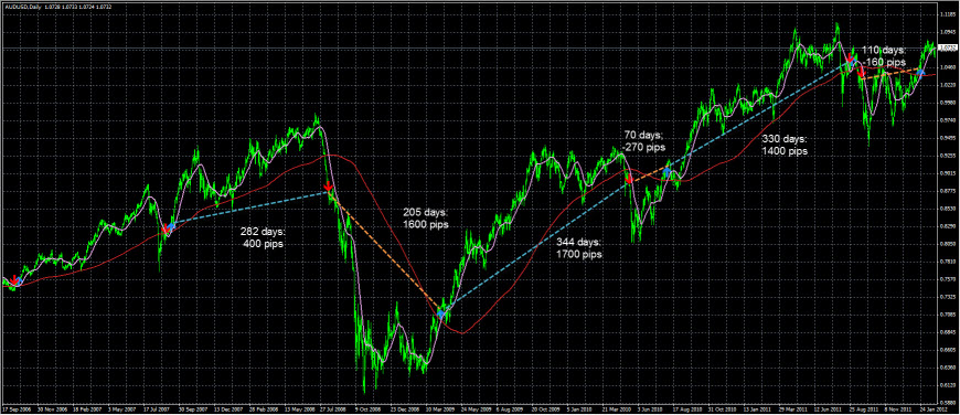 请注意,当 20 日均线在 2008 年下穿 200 日均线时,它成功地在危机的下行趋势中上涨了 1600 点,然后在 2009 年交叉时,它成功地在从危机的上升趋势恢复中获得了 2700 点左右。 2009 年 3 月至 2011 年 7 月。 这种黄金交叉策略对于捕捉长期外汇趋势确实非常强大。 由于市场的分形性质,它也可以是在较小时间范围内使用的强大组合。