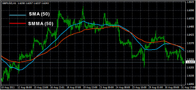 这是 GBPUSD H1 图表上的 50 EMA 与 25 SMMA: