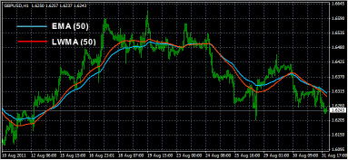例如,这是 GBPUSD H1 图表上的 50 EMA 与 50 LWMA: