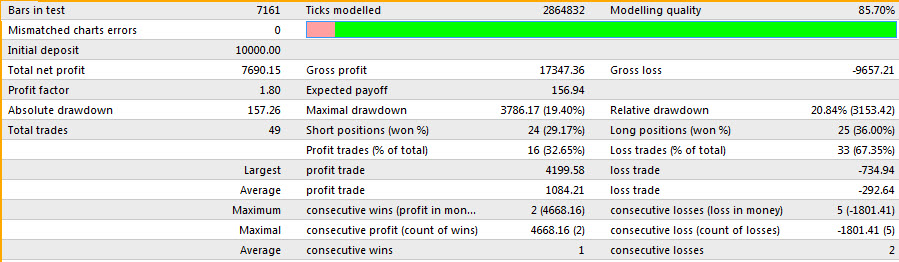 该 EA 在 49 次交易(16 次获胜)和 28 年(每年 2.8% 的回报率)中产生了 7690 美元/7690 点/76% 的回报,如果您碰巧从错误的起点开始,则会遭受 3786 美元/3780 点/37% 的回撤 时间。 如果您能忍受这种下降,那么这些都是不错的结果,因为在超过 28 年的时间里,大多数 EA 的性能都会严重下降,而这个 EA 却始终保持领先地位并产生了结果。