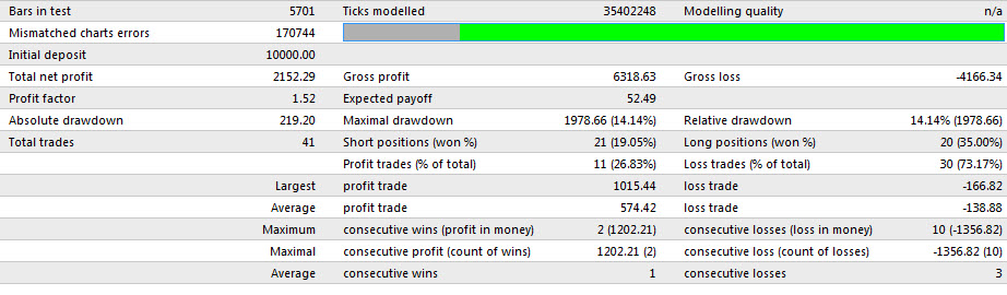 如您所见,EA 看起来很有前途。 它在 3 年(每年 7%)和 41 笔交易(11 次胜利)中获得了 2152 美元/2152 点/21% 的回报,同时遭受了 1978 美元/1978 点/19% 的亏损。 我喜欢看到每年的业绩翻了一番,总体统计数据与过去 38 年的情况大致相同。 请记住,对策略进行回溯测试的时间越长,退化的可能性就越大。 很少有 EA 策略开发人员/供应商会在他们的 EA 上显示超过 3 年的回测,甚至更少的部分可以显示超过 10 年。 他们没有显示,因为他们已经将他们的策略曲线拟合到最近的数据周期,而它在之前的周期根本不起作用。 我在上面创建的 EA 是一个没有优化和曲线拟合的基本系统,在 41 年的时间里,它在捕捉更大趋势方面表现得非常可靠。