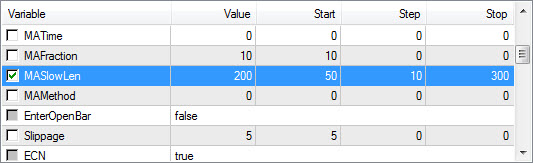 我们对 SlowMA 长度的优化范围将从 50-300(以 10 为步长),从而为我们提供 25 种可能的组合。 我们将使用简单移动平均线进行此优化,然后对指数移动平均线进行相同的优化。