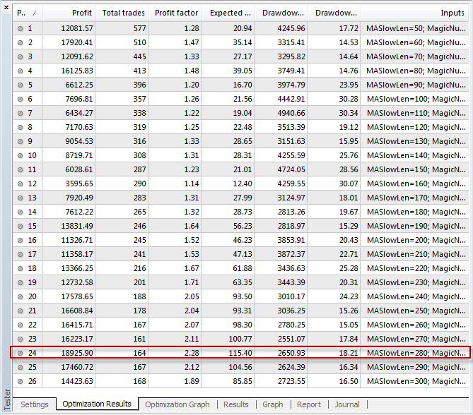 注意结果如何随着每个连续的更长长度而改善。 似乎 H4 移动平均线交叉在较长长度的平滑因子下表现最佳。 绝对最高的结果是 280 的缓慢长度,导致出色的 18925 美元/18925 点和非常健康的利润因子 2.28。 请注意它如何比 200 慢线多赚 7000 点,最大回撤少 1200 点。 20-200 组合的最大回撤是 3853 点,而 20-280 组合的最大回撤是 2650 点。 这一切都非常有希望。
