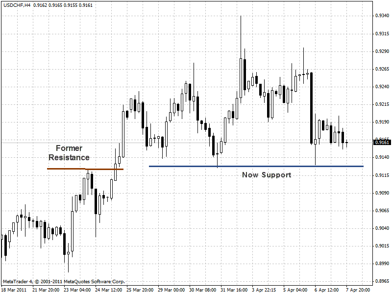 在上面的美元兑瑞郎图表中,关键阻力位 (0.9130) 在 2011 年 3 月 25 日被突破,这向交易员发出未来两周看涨该货币对的信号。 之前的阻力区变成了支撑位,卖家不愿进一步向下交易,而买家认为这是向上交易的最佳机会。