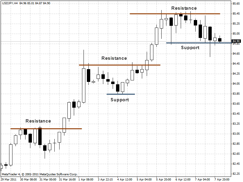 上图是阻力顽固保持然后突破的另一个例子。 第一个阻力线在 3 月 30 日确定为 83.15,并在多次不成功的攻击中保持在一起,但随后在 3 月 31 日,它终于被打破,使其上涨了 150 个点。